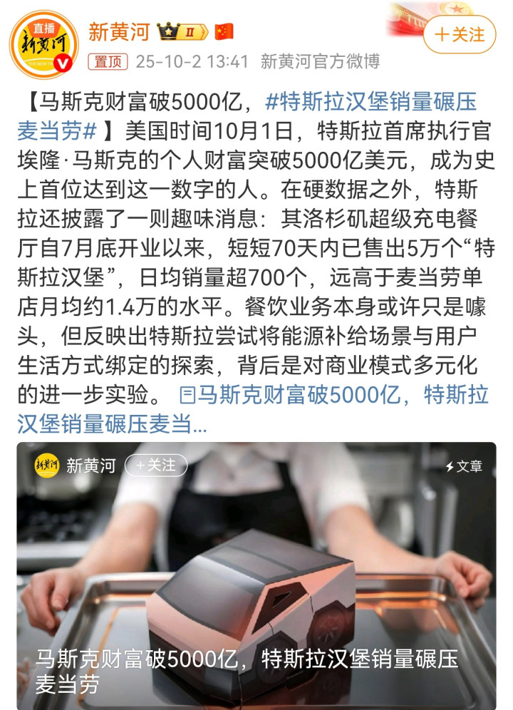 特斯拉洛杉矶超级充电餐厅开业约70天,"特斯拉汉堡"已售出5万个,日均销量约715个。这一数据超越了麦当劳单店约1.4万的月均销量,成功跨界引发热议。